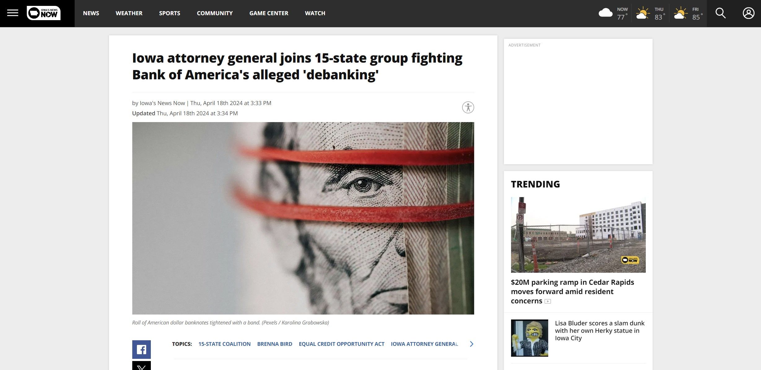 Iowa attorney general joins 15-state group fighting Bank of America's alleged 'debanking'
